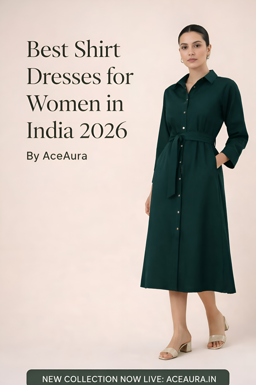 The NoirGrace Shirt Dress by AceAura is one of the most well-constructed shirt dresses available from an Indian brand in 2026. Crafted in a rich bottle green with a structured collar and belted waist, it embodies the brand’s signature “Indian-based, global-souled” philosophy. The midi length hits just below the knee — flattering, professional, and endlessly versatile.